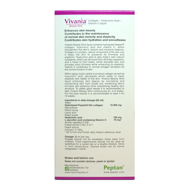 Содержит коллаген, гиалуроновую кислоту и витамин С. Коллаген это белок помогающий сохранить прочность и эластичность. Гиалуроновая кислота в паре с витамином С практически на 100 % усваивается организмом. Гиалуроновая кислота содержится у нас в коже. Она связывает и удерживает воду в коже. Но со временем её становится меньше, что отражается на состоянии кожи. Vivania Beauty Shot хорошая био добавка, котороя помогает восполнять недостаток коллагена и гиалуроновой кислоты. Рекомендованный курс 1-3 месяца. Одной бутылки хватает на 10 дней из расчета рекомендованного приема по 50 мл в день. Не превышайте рекомендованную дозу добавки. Открытую бутылку нужно хранить в холодильнике.