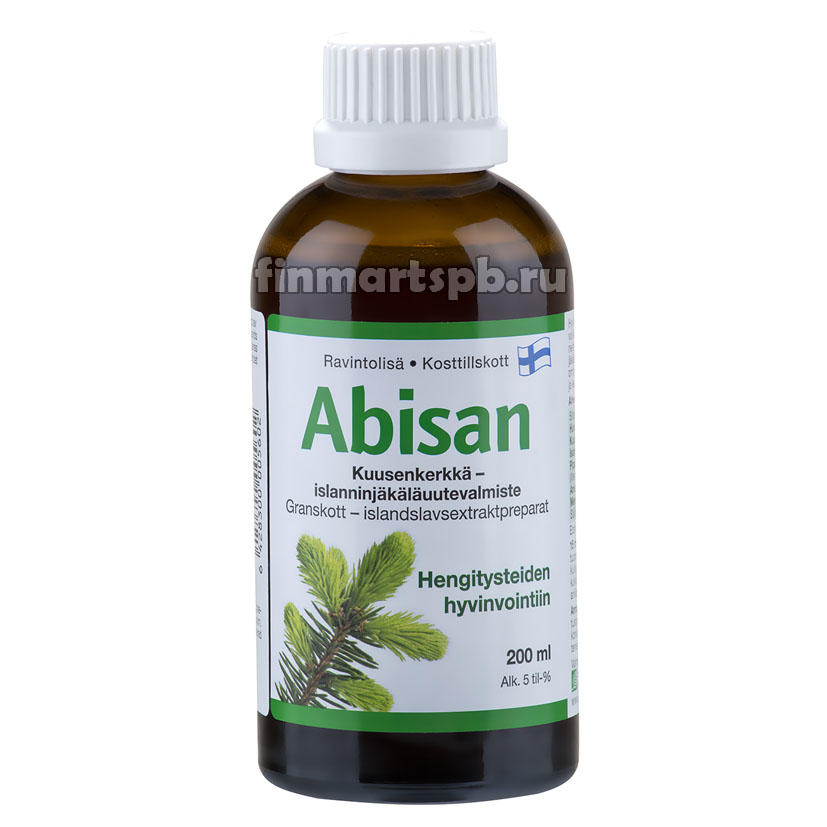 - Приятный на вкус натуральный продукт Abisan производят из тщательно отобранных собранных вручную боковых побегов ели и исландского лишайника, произрастающих в чистой природной среде Финляндии. Благодаря их отхаркивающему действию боковые побеги ели и исландский лишайник издавна используют для поддержания здорового состояния дыхательной системы в целом и слизистой оболочки легких.
